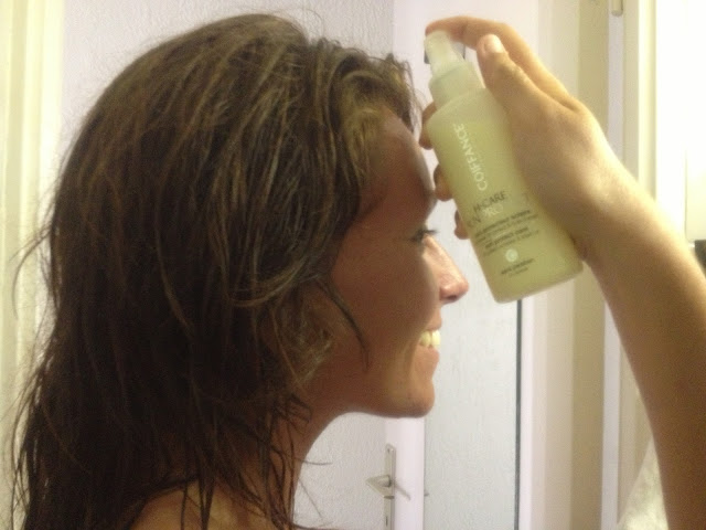 Je l’utilise le plus souvent sur cheveux humides avant l’exposition au soleil .Je peigne délicatement afin de répartir le produit sur toute ma chevelure.