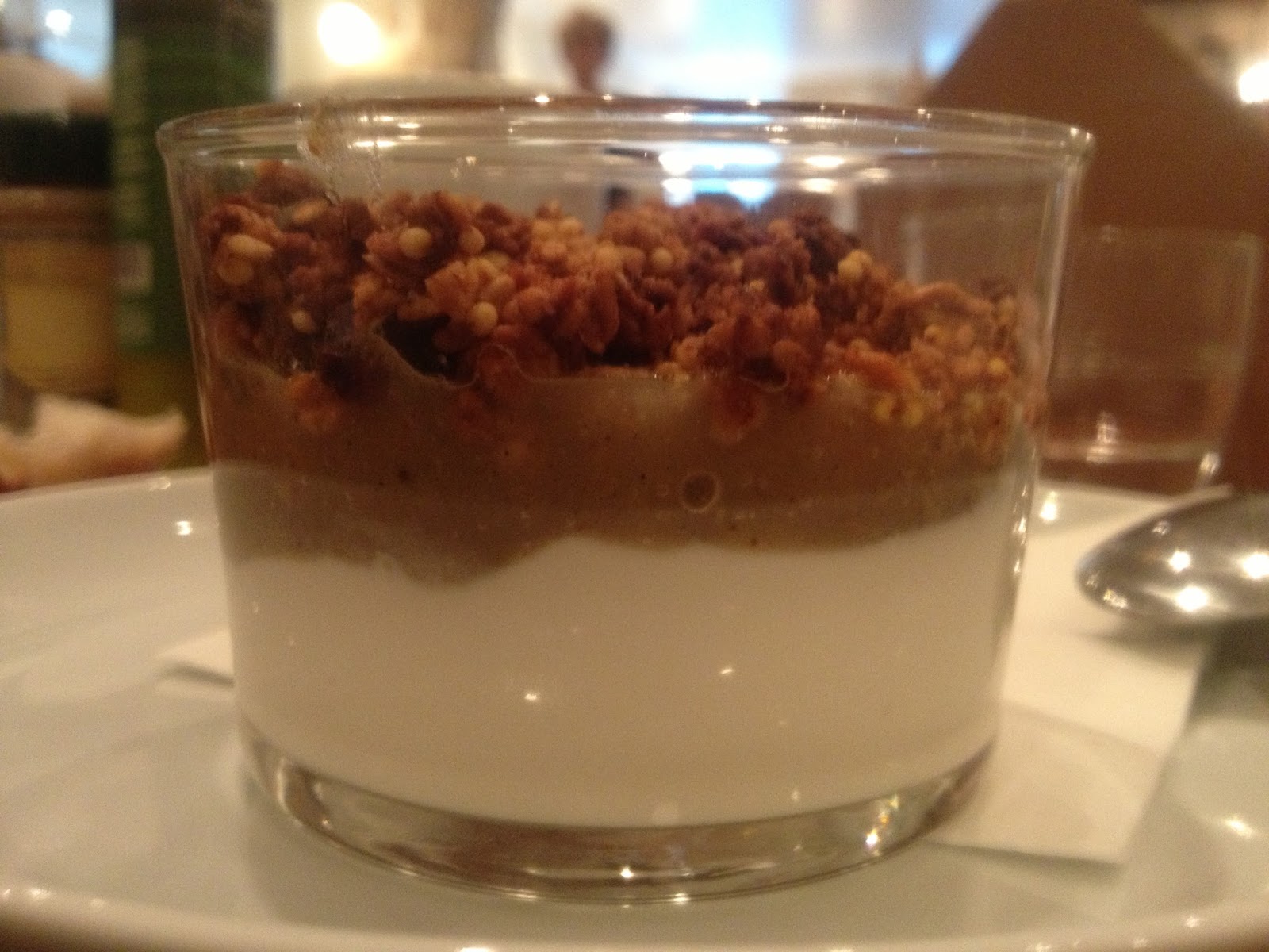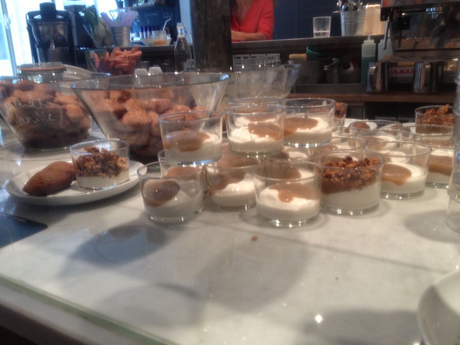 Mais ce n’est pas fini, s’ensuit une assiette de sucré avec une verrine de fromage blanc- confiture de rhubarbe, d’un granola maison ( que vous pouvez d’ailleurs acheter au bar) et de deux madeleines maison sucrées comme il faut.