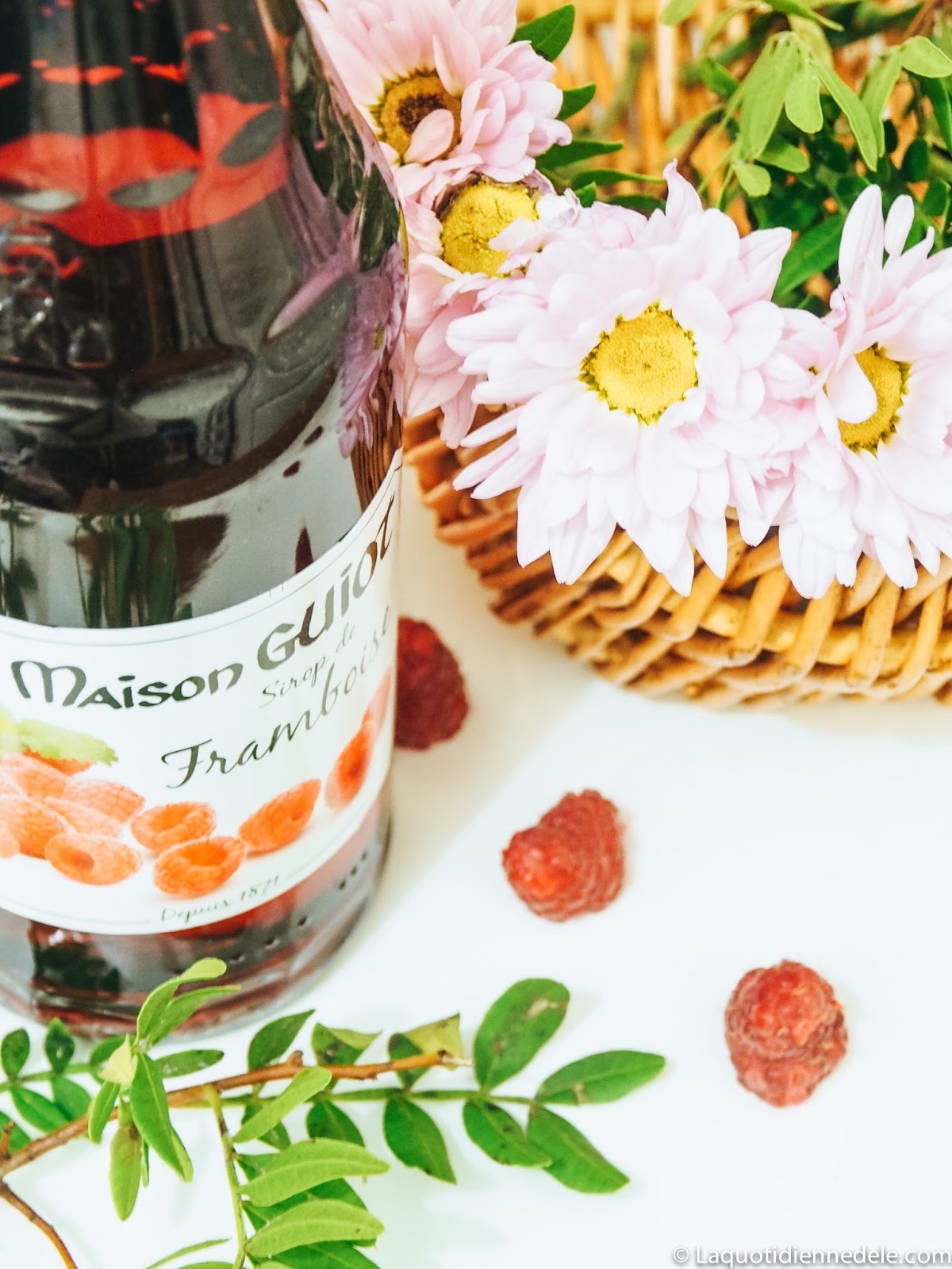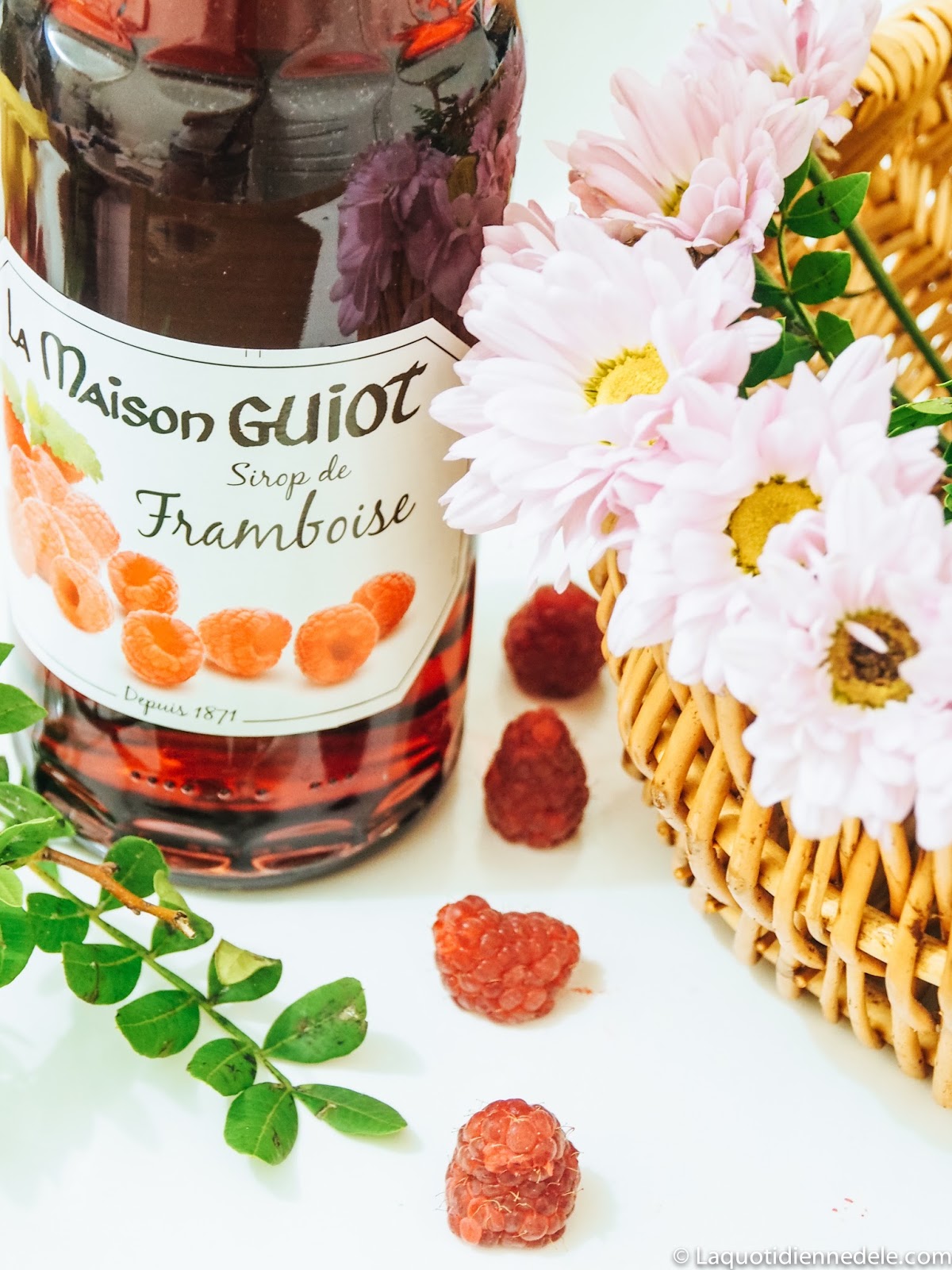 J’utilise celui de la maison Guiot que j’ai découvert très récemment.Les sirops ont souvent tendance à être trop sucrés avec un sur-ajout de sucre. Celui de la Maison Guiot est bien loin de cela, mettant au contraire en valeur les saveurs de la framboise. Son goût est intense mais subtile.