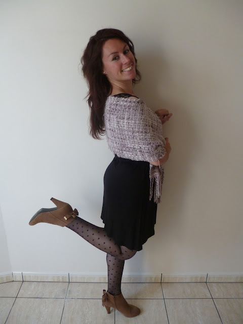 Le collant à petits pois permet un coordonné avec le haut de la robe , même si le motif est différent.