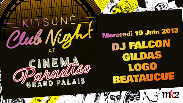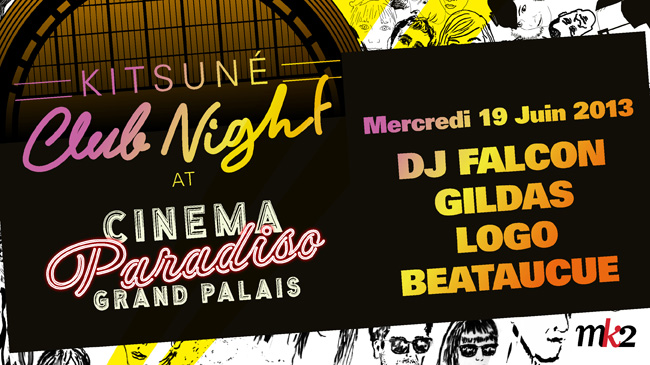 Dans le cadre de l’événement Cinéma Paradiso, soyez au rendez-vous pour la soirée Kitsuné Club Night qui se déroulera dans la Nef du Grand Palais, le 19 juin, avec le boss du label Gildas, le producteur et collaborateur du dernier album des Daft Punk, Dj Falcon, le duo Parisien LOGO et les producteurs BeatauCue!