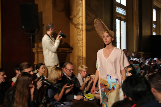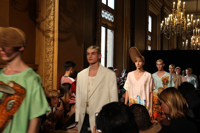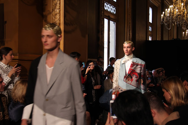 Dans la rotonde, assise au début du catwalk, je sors mon reflex pour photographier les oeuvres d’art modesques du créateur, différentes pièces riches en couleurs pastel et formes géométriques.