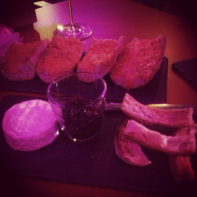 au Pan con tomate huile d’olive, ail et au Pélardon des Cévennes, confiture de cerises, pain toasté.