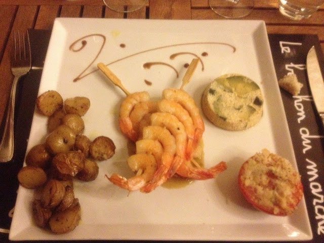 En plat , nous avons craqué pour un Duo de Brochette de Crevettes au Curry