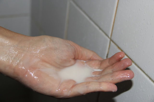répartissant une noix de shampooing sur mes cheveux mouillés. Je fais fais mousser tout en massant le cuir chevelu ( moment de détente assuré!).