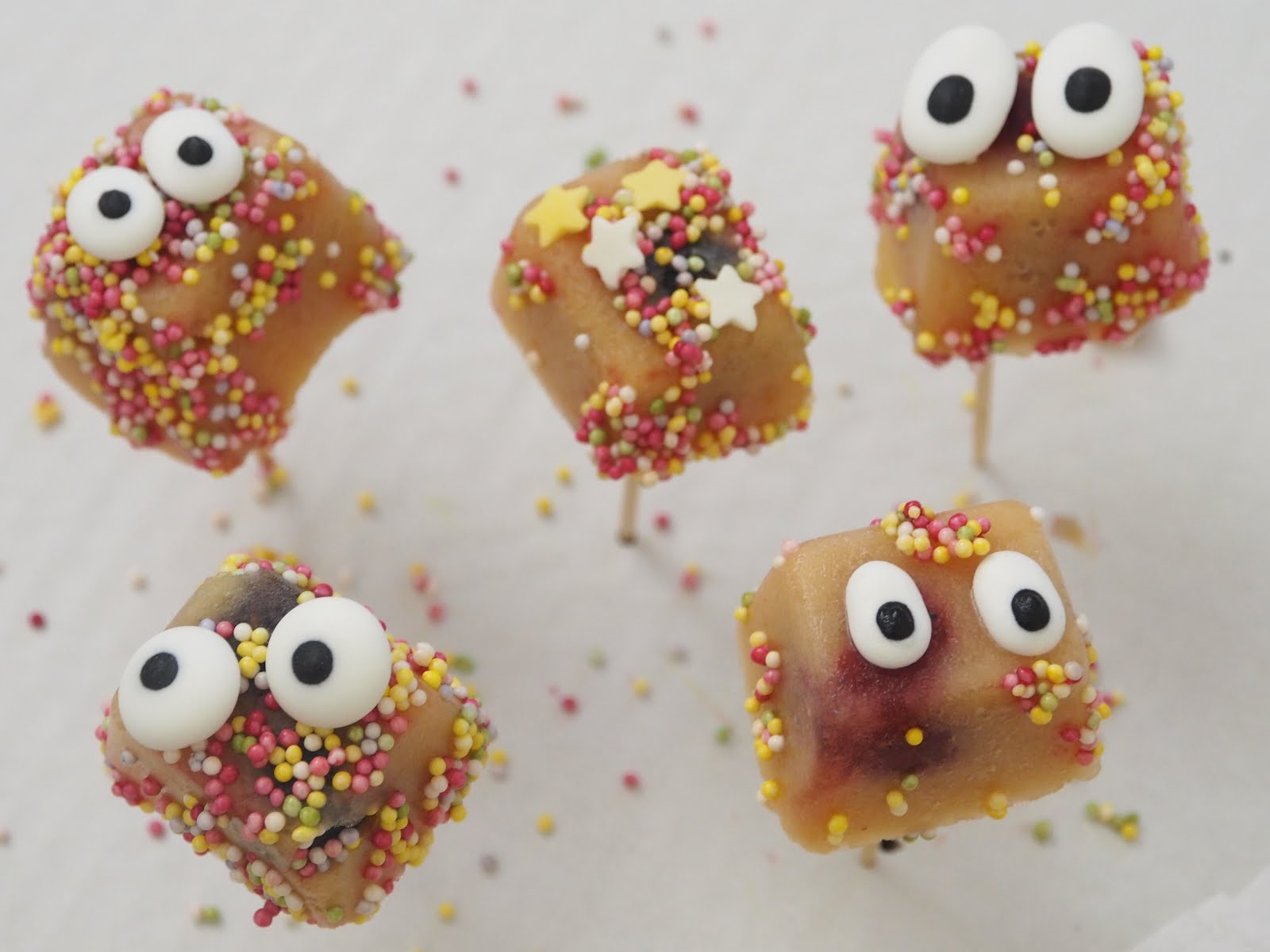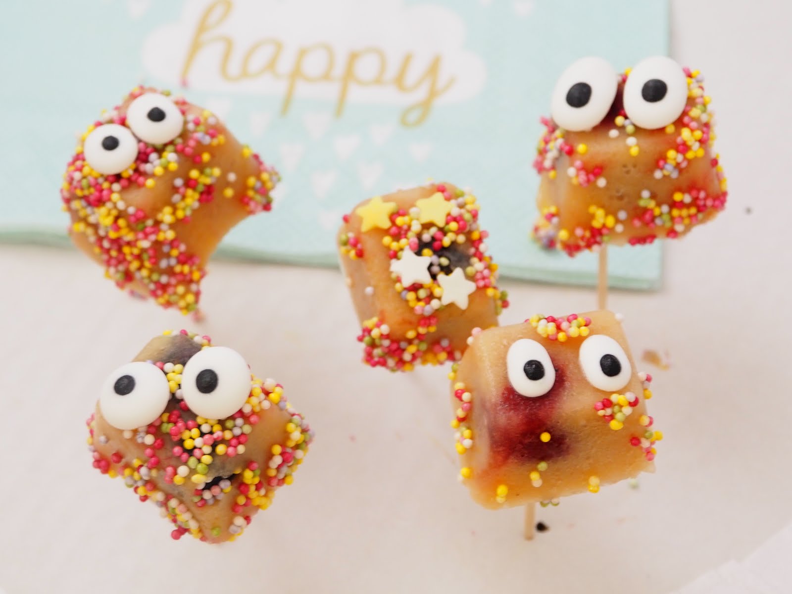 Je me suis tout de même permise un peu de fantaisie dans la déco. Le rectangle en glaçon n’est pas ce qu’il y a de plus présentable. Je me suis donc amusée à les détourner en créant des petites têtes rigolotes. J’ai ajouté des perles de confiserie multicolores Vahiné et deux yeux meringués Vahiné.