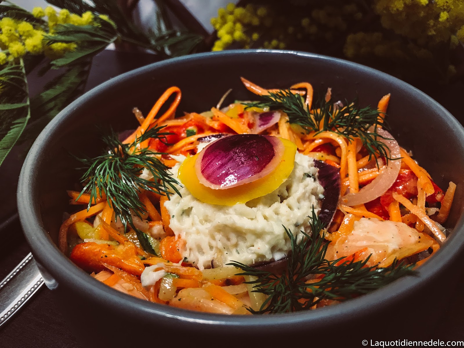 Épluchez les carottes,les courgettes, les oignons. Puis,coupez les carottes, les courgettes,les poivrons, les tomates et les oignons en julienne.Faites chauffer (un wok si vous avez) ou une cocotte et faîtes revenir les légumes dans de l’huile d’olive. Poêlez à feu vif pendant 10 minutes. Pour donner encore plus de saveurs, ajoutez 1 cuillère à café de cumin en poudre.Dans une seconde poêle, versez du beurre et de l’huile d’olive et faîtes revenir des morceaux de cabillaud et saumon, sans le faire dorer, à feux doux.