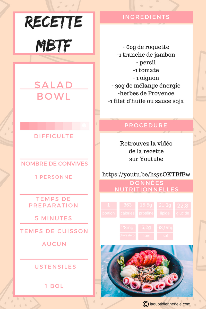 12 Aujourd’hui, on se retrouve pour la 3ème recette. Voici la fiche recette téléchargeable et cliquable sur le lien de la vidéo. Recette à télécharger : Salad Bowl Share 0 FacebookTwitterPinterestEmail bodyandfly previous post MY BACK TO FIT : Recette JOUR #2 pour perdre 1kilo en 1 semaine next post Ma Déco : Mon petit Salon You may also like Ghost pancakes – Pancakes fantômes 27 octobre 2025 Gâteau d’automne 19 octobre 2025 Recette Cookie healthy à la farine de lupin 24 mars 2024 Crumble à la patate douce : Un Délice... 17 novembre 2023 Hachis parmentier à la patate douce 4 novembre 2023 Nouilles de konjac forestières : Recette perte de... 1 novembre 2023 Tacos mexicains : recette healthy et protéinée 31 octobre 2023 Recette de Riz au lait noir healthy 28 octobre 2023 Recette de gyoza aux légumes et Concours Cassegrain 25 avril 2021 Recette de Panna Cotta healthy sans gélatine –... 7 avril 2021 Leave a Comment Cancel Reply Save my name, email, and website in this browser for the next time I comment. Δ Ce site utilise Akismet pour réduire les indésirables. En savoir plus sur la façon dont les données de vos commentaires sont traitées.