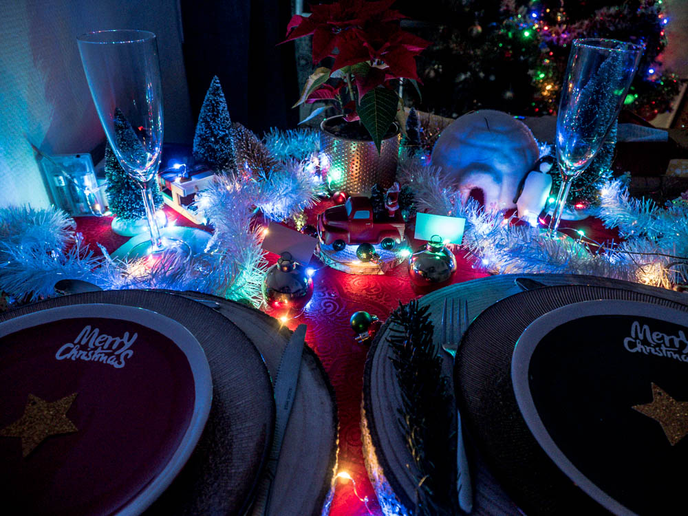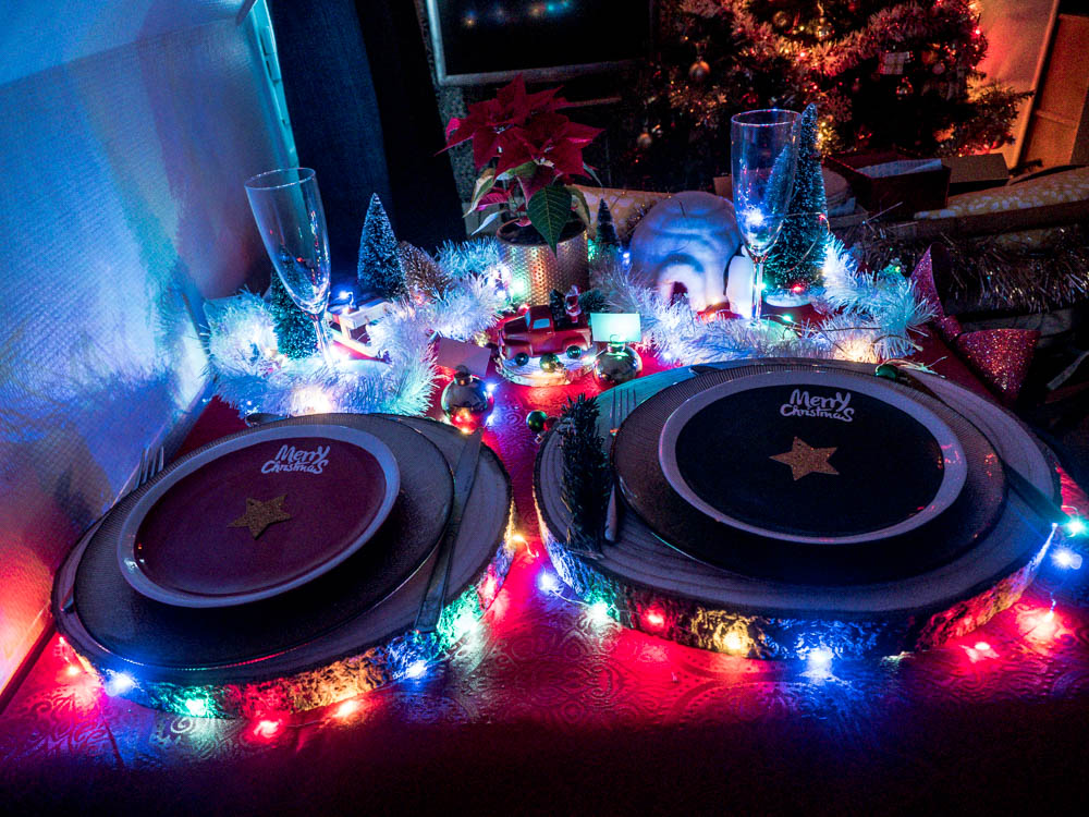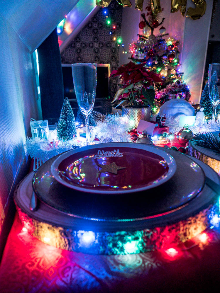 Personnellement c’est mon plaisir de fin d’année : mettre des petites guirlandes lumineuses partout , tant sur le sapin que sur la table. C’est festif, ça habille la table et cela donne un effet magique.