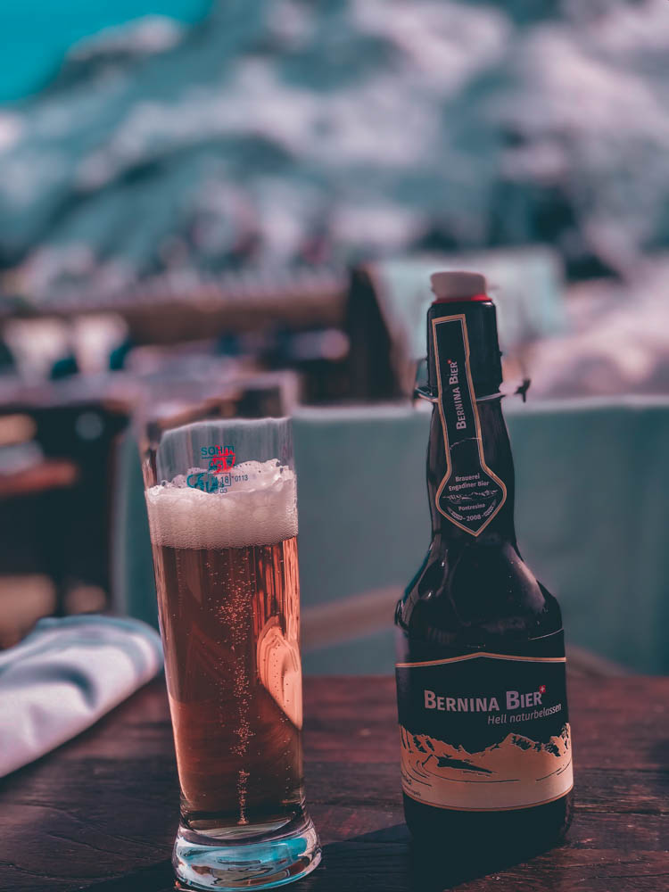 Salastrains : Il permet de chiller au soleil avec un verre tout en contemplant la chaîne de montagnes ou de faire une pause gourmande après une matinée de ski. Le cadre est vraiment sympa et l’accueil est chaleureux. J’ai voulu tester une bière locale : La Bernina Bier. Fruitée , elle est légère et agréable à boire en altitude. Bien évidemment, vous pouvez choisir un chocolat chaud si vous préférez.