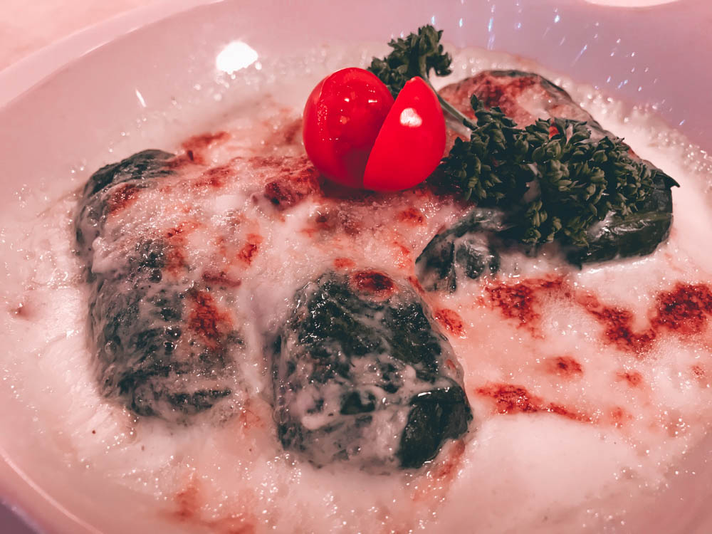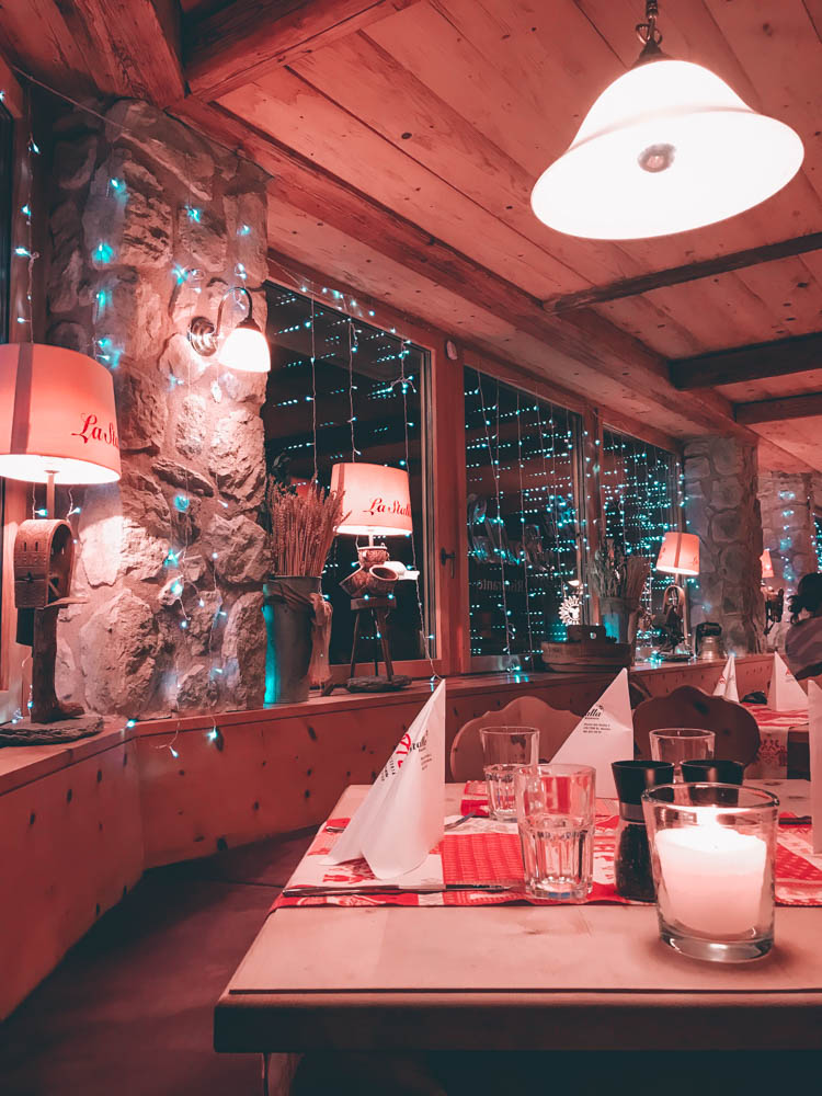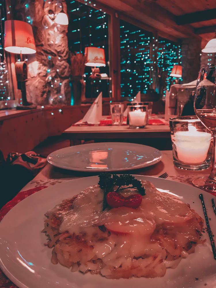 Spécialités suisses : A Saint-Moritz, j’ai choisi de dîner au restaurant Le Stella, situé au coeur de la station. L’accueil est très convivial et le service est rapide.La décoration en bois et les petites lumières donnent un cadre intimiste et feutré à ce lieu. STORY : Pour la petite histoire, au moment où je regardais la carte des menus, une chorale locale est venue chanter dans le restaurant pour fêter l’arrivée de la nouvelle saison. C’est très authentique et typique. La tradition perdure. Une vraie surprise authentique. Je vous recommande : deux spécialités du canton des Grisons Le rösti : une galette de pommes de terre finement coupées en lamelles recouvertes de jambon, de tomates et de fromage. C’est un vrai délice! Les capuns ( à prononcer capouns): de la viande de grisons enroulée de feuilles de blettes. Personnellement je n’aime pas ce légume. Je l’ai redécouvert grâce à ce plat. Pour les amateurs de vin, je vous recommande un vin du pays.